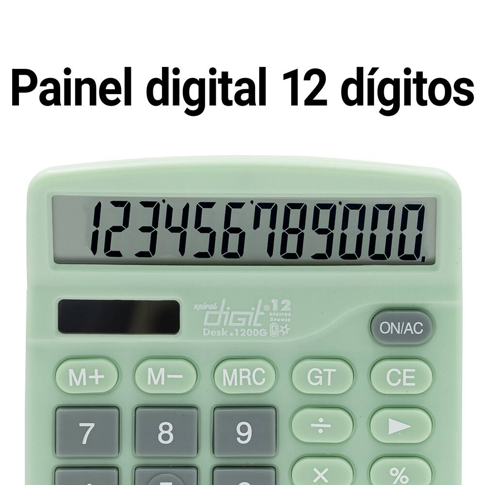 Calculadora de mesa Digit 1200G Legibilidade: Display grande 12 dígitos 2 fontes de energia: bateria e solar Auto - desliga Inclinação do visor Função deletar Energia